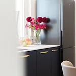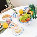A shared kitchen is featured with a fridge, an oven, and glassware, as well as coffee/tea making equipment, ensuring a better dining experience.